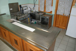 La zone de cuisine se situe derrière le bar (réfrigéré) et est constituée d’un frigo, une cuisinière (plaques de cuisson, four), un évier avec jet de plonge, un lave vaisselle, une cafetière et tous les accessoires nécessaires…